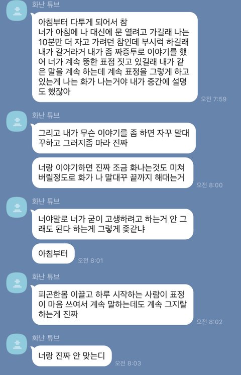 제가 너무 빠듯하지 않냐고 했다가, 딴지건다고 뭐라고 해서 제 표정이 안좋았대요 그래서 또 싸우게됐어요