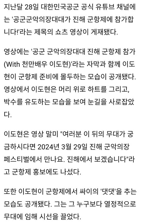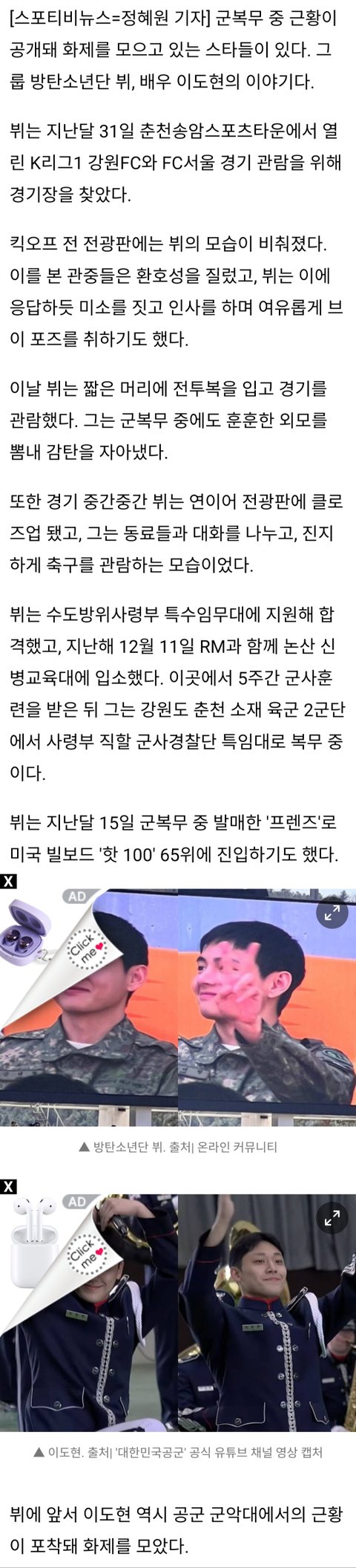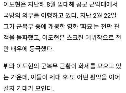 둘 다 내가 좋아해 뷔는 군대가서도 훈훈한 목격담 계속나오고 군생활도 ㅈㄴ잘함 이번에 축구장간거 목격담 아직도 뜨더라 반응 개좋음ㅋㅋㅋㅋ 이도현은 공군 군악대갔는데 진해 군항제에서 서비스 좋았나봄 역시 반응 좋아ㅎㅎ 전역후에도 기대됨 극호