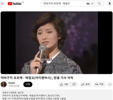 (사진2 설명) 야마구치 모모에(山口百恵) - '아이젠바시(愛染橋, 애염교)' YouTube 일본 TV 동영상 화면 캡춰