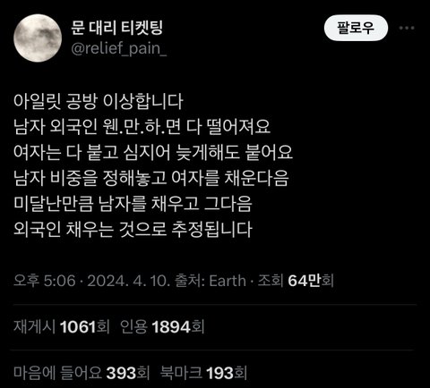 대리 티켓팅 계정이 올린거면 자기가 여러명 공방 대리 했는데 남자만 미당첨 떠서 저러는 거 아녀?