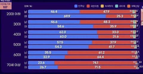 솔직히 한 인간이 가지고 있는 모든 사상,경제관,철학,세상을 바라보는 시각 등 모든게 축약된게 정치관이라고 생각하거든? 근데 그 정치관에서 같은 시기에 같은 교육 받고 같은 시대정신 가지고 살아온 세대가 남녀라는 이유로 저렇게 다른거 봐 ㅋㅋㅋ 그냥 공유하는 가치관,사상 자체가 다른건데 어떻게 호감이 생기고 연애를 하고 결혼을 하겠어ㅋㅋㅋ나부터도 어떤남자가 정치관 들어냈을때 그냥 내 머리속의 데이터베이스 작동되어서 아....어떤 사람인지 알겠다 ㅎ