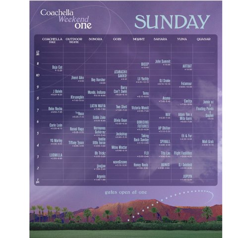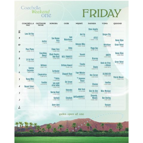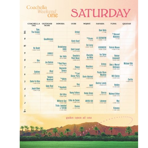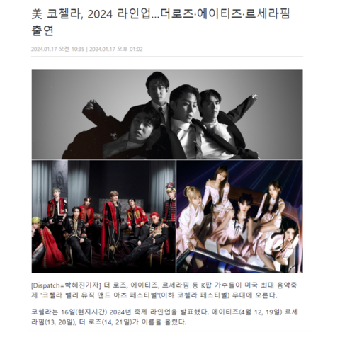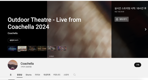 에이티즈 - 4월 13일 토요일 오후 2시 45분르세라핌 - 4월 14일 일요일 오후 2시 50분더로즈 - 4월 15일 월요일 오전 10시 25분시청방법코첼라 유튜브 생중계로 볼 수 있음