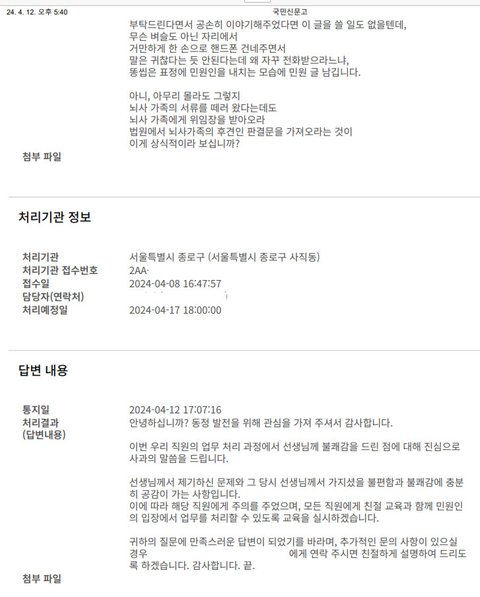 어찌하라마라 말없이 그냥 민원 업무를 끝내더군요.
