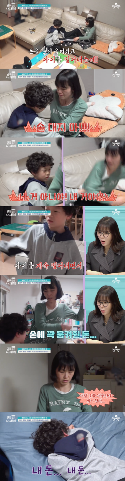 더 큰 문제는 아이들을 대하는 태도였다. 생애 첫 용돈을 받은 아이들은 문구점에서 자신이 사고 싶은 걸 쇼핑하기로 했다. 하지만 엄마는 샤프를 산 둘째를 못마땅해했고 급기야 “다음 주부터 네 용돈 없다”며 아이의 용돈을 빼앗았다. 둘째는 “내 돈”이라고 매달렸고 엄마는 아이를 향해 발길질하며 “손대지마. 네 거 아니야. 내 거야. 버르장머리가 없다”고 소리쳤다.