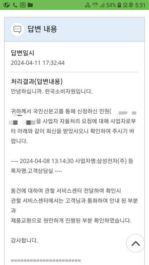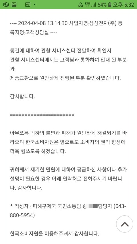 소비자보호원 담당자가 교환이 원만하게 진행되었다고