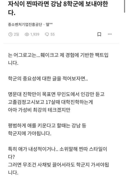 내가 성격이 찐따고 적응 잘 못하는 성격이면 더 지잡대 가면 안됨 내가 그 케이스였거든? 근데 올해 편입하고 인서울 중하위권이라도 오니까 환경 자체가 다르더라 자식이 찐따면 강남8학군 보내라는 글 있잖아 그거 틀린말 하나도 없음 대학교도 마찬가지임 거기서 공부 열심히하고 잘하는 애들 당연히 없고 뭔 학창시절 양아치인 애들만 있음 그리고 어학연수 교환학생 각종 학교 프로그램 활성화 안되어있음 학교시설 꾸지고 도서관도 출입증 없어도 그냥 들어감 이게 진짜 나같이 찐따인데 학교 생활 열심히 해보려는 사람한테는 우울증 무기력함 다 옴 거기서 성적 잘 받는다해도 솔직히 의미 하나도 없고 빨리 학교 탈출하는게 승리자임 나 편입하고 주변애들 보고 많이 느꼈어 다들 열심히살고 공부 잘하는구나 이렇게 살면 안되는구나 이런것들.. 정규입학한 새내기들이 부럽더라고