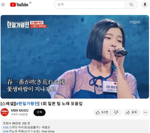 (사진3 설명) 스미다 아이코(住田愛子) 한일가왕전 YouTube MBN 동영상 화면 캡춰
