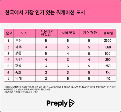국내에서는 부산이 가장 인기 있는 워케이션 도시로 꼽혔으며, 제주, 강릉, 양양이 그 뒤를 이었다.또한, 해외에서는 태국의 치앙마이, 베트남의 호치민, 말레이시아의 쿠알라룸푸르가 한국인에게 인기 있는 워케이션 도시로 선정됐다.