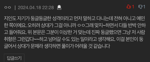 (+ 본문에 “ 백에 백번을 저한테만 부정해서 알아차렸습니다”라고 했습니다. 그게 쓰게된 주된이유라고 했는데, 어떤 댓글에 자기 지인이 둥글다고 하는데, 지인은 둥근게 아니라 예민하다 며 예민한 사람과 진짜 둥근사람에 대한 내용이었습니다. 둥근사람도 자신을 지킬 화는 필요하고, 둥근사람도 사람이기때문에 화가 있습니다. 다만 저의 방식의 경우 화를 낼 상황을 최대한 피해왔습니다. 댓글이 왜 얘기가 그쪽으로 흘러가는지 사실 이해하기 힘들었습니다. 또 남을 빗대어 상대를 욕하는 사람에게 알려주신 내용대로 할려했지만 ”반대로 반박+농담” 적용이 어려웠습니다. 우선 저를 직접적으로 예민한 사람인양 말하기때문에 제가 감정으로 추수리지 못해 조언을 제대로 이행하기 어렵습니다. 또한 이유를 말했기때문에, 비난아닌 비판으로 받아드립니다. 하지만 비판이 아니라 비난인게 둥근사람도 화날때가 있는건데 그 자체를 없다시피하는거니깐요. 안친한대 아예 면전에 너 예민한거다라고 그래도 해야하는 거겠죠? 사회생활하시는 분들의 우문현답 부탁드립니다ㅜㅜ 이럴땐 어떻게 해야하나요?)
