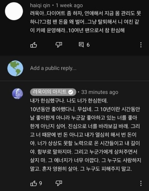 려욱팬은 아니지만 n년차 엘프인데 솔직히 좀 상처긴 함 비인기멤이라해도 팬들이 있고 자기관리해야하는게 맞지않나.. 물론 현재 몇키로인지는 모르지만 화면으로 볼 때 살이 좀 붙어보인다는거니까 데뷔전에 열심히 다이어트해서 살뺀거 알겠고 저 말이 상처였을거 아는데 굳이 저렇게 반응 했어야했나 싶네 년차 찼으니까 상관없다는건가 팬들이 앨범 사고 스밍돌리고 콘서트하면 티켓 팔아줘 방송나오면 시청률 올려줘 영상 올리면 조회수 올려줘 본인도 노력했겠지만 팬 없었으면 그 자리까지 못 올라가고 사라지지않았을까.. 최애멤이 따로 있어서 몰랐는데 대처가 좀 아쉽긴 함..ㅠㅠ