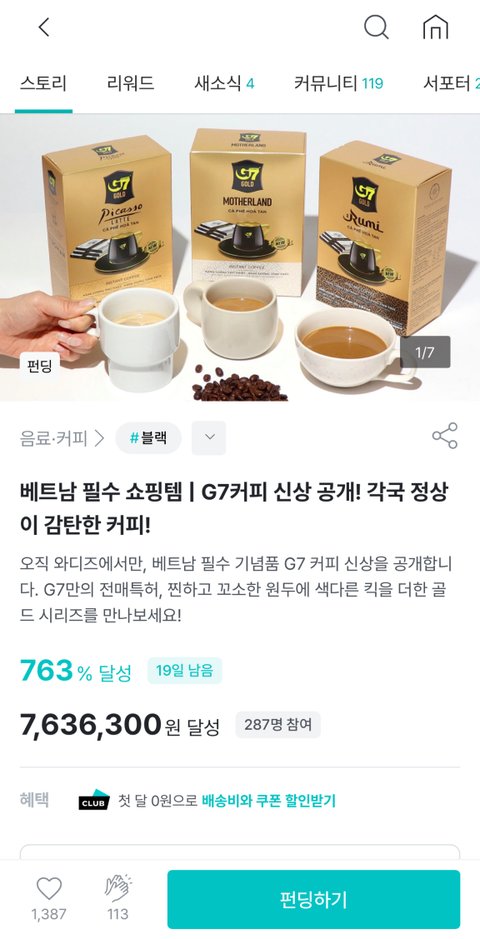 와디즈 보는데 G7커피 펀딩 오픈 되었네요베트남 갔다 오는 지인들 보면 꼭 사오긴 하던데저는 아직 마셔본 적 없어서요전용 컵도 줘서 사볼까 하는데 맛있나요?