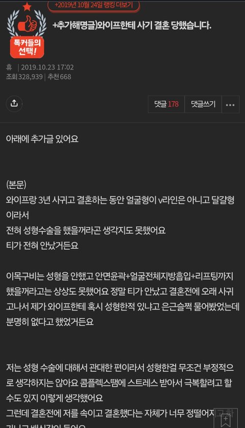 와이프랑 3년 사귀고 결혼하는 동안 얼굴형이 v라인은 아니고 달걀형이라서 전혀 성형수술을 했을꺼라곤 생각지도 못했어요 티가 전혀 안났거든요