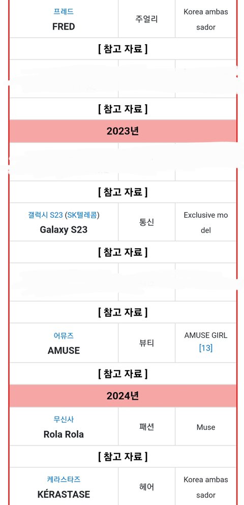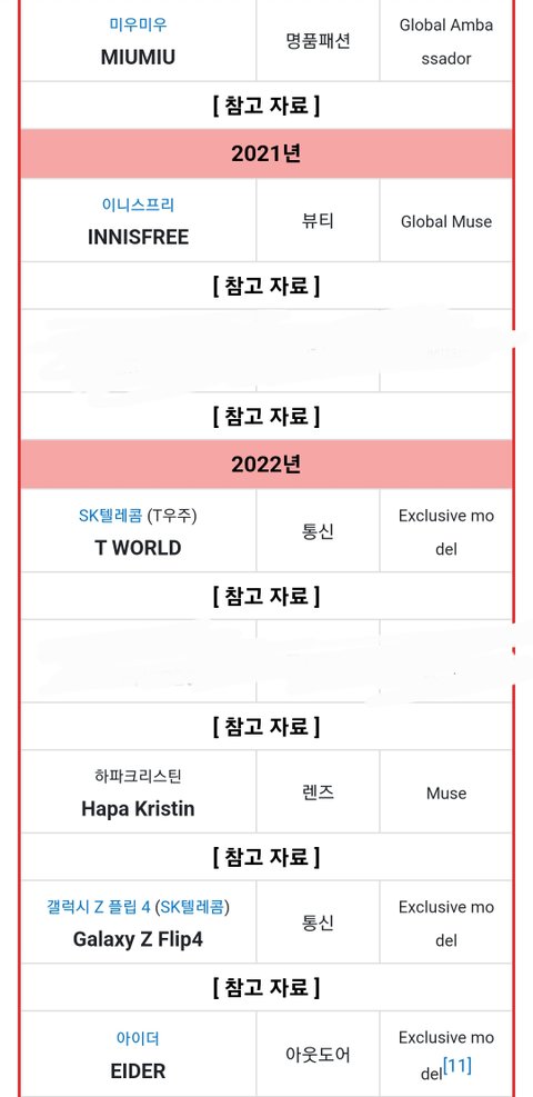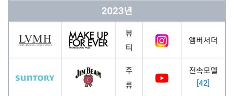 이 외에 지젤 로에베 글로벌 엠버서더, 닝닝 베르세체 글로벌 엠버서더이고 단체로는 MLB,미쟝센,KB 국민은행,롯데면세점,쇼파드,나바티리초코까지 총 6개 하고 있음.