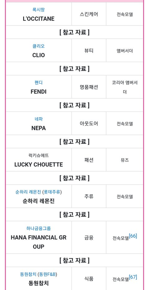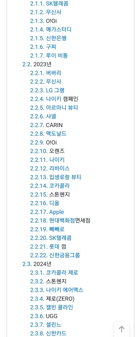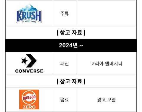 너무 많아서 분류 불가 무신사,버버리,메가스터디를 제외하고 현재 다 찍고있음. 샤넬 디올 구찌 아르마니 루이비통 셀린느 맥 UGG는 멤버 개인 엠버서더임.