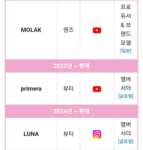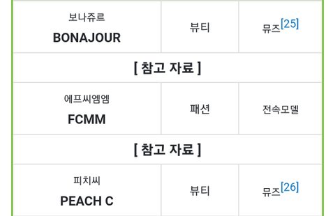 이 외에 리즈 지그재그,이서 노스페이스와 화이트라벨이 있고 단체로는 퓨마,옥수수 수염차, 펩시, 파파존스