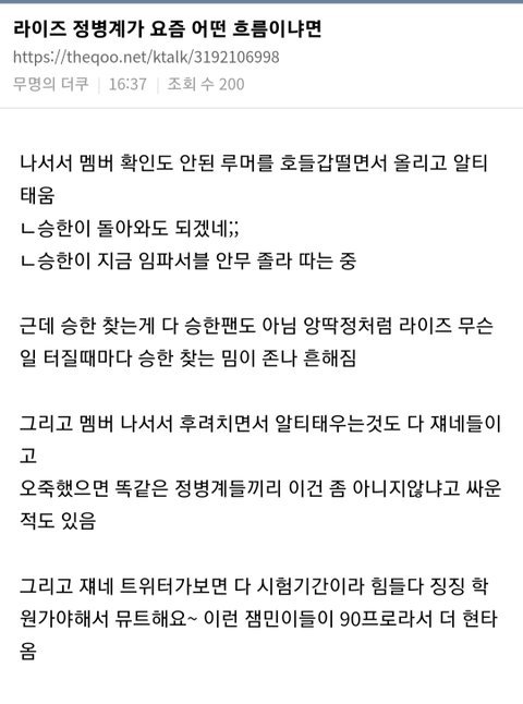 그만들 좀 하셈 사실여부 확인도 안된거 가지고 트위터에서 조롱 알티 ㅈㄴ 태우고 기정사실화해서 여기저기서 성희롱하고 까는거 지긋지긋해 죽겟음 정병계들 스핀으로 지들끼리 가독성 ㅈㄴ 떨어지게 앙딱정 ㅇㅈㄹ하면서 계속 나대니까 전여친들이며 그 시녀들이며 나대는거잖아 얘네 디엠 내용을 애초에 왜 다 믿어줌? 언제는 퐁퐁이라면서 조롱하더니 이제는 뭐 바람피는 사람으로 만들고ㅋㅋ 그리고 스엠도 제발 고소 과정 공지 좀 내라 고소한다고 말만 해놓고 보여주는게 없으니까 루머만 자꾸 커지고 기정사실화돼서 욕먹잖아