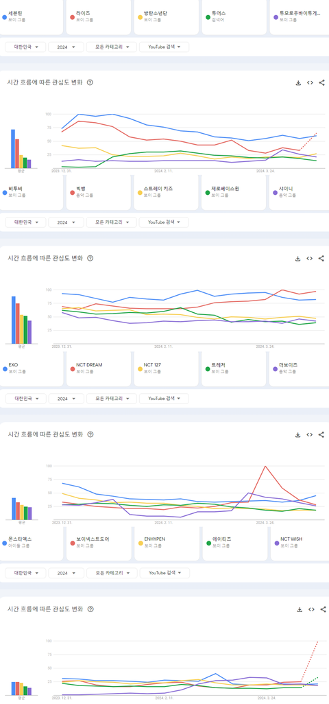2024년 현재까지 국내 유튜브에서 가장 많이 검색된 케이팝 남자아이돌그룹 TOP20