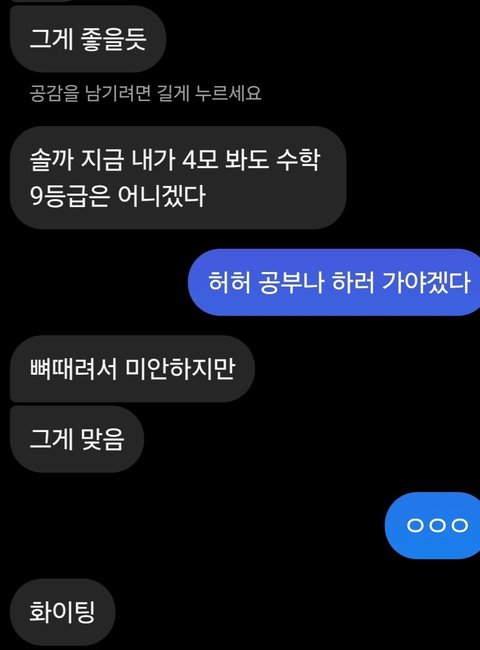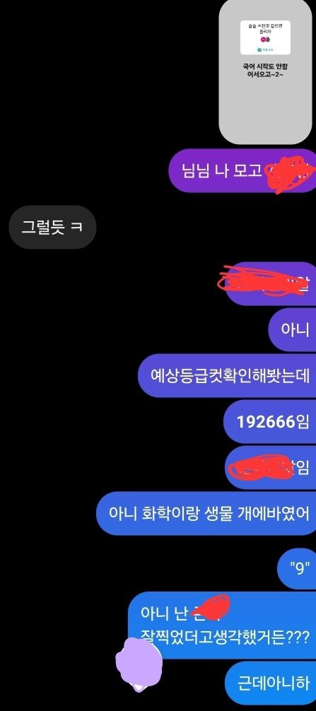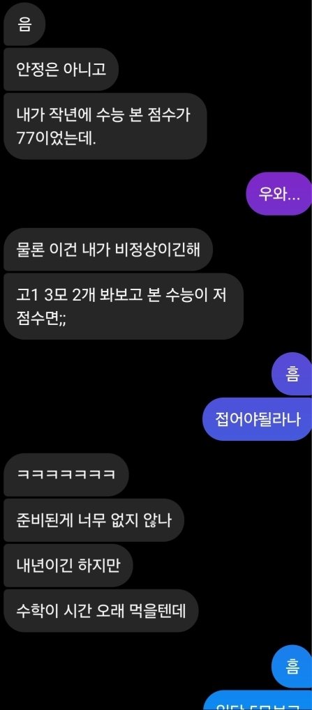 4더프 점수고 내년 수능 볼 예정이야. 국어 영어 제외하고는 진도 하나도 안빼서 등급 저렇게 나왔어. 솔직히 나도 접어야한다고 생각하긴 하는데 음 그래 내가 사과하는게 맞겠지 거ㅐㄴ히 나대서 쟤만 신경쓰이게 만들고. 고맙다고 해야하나