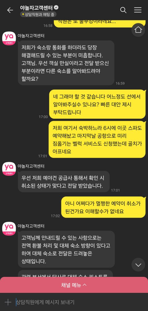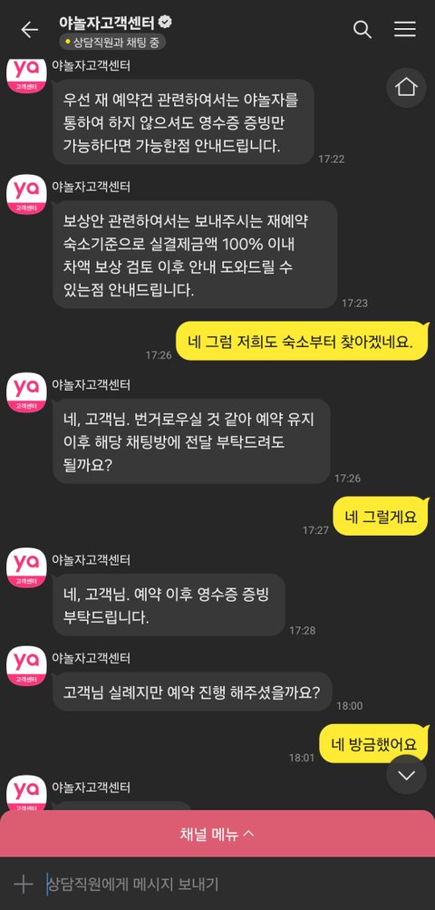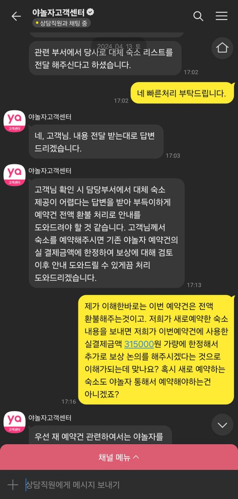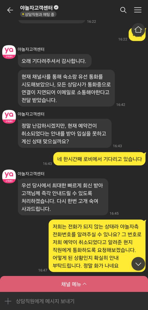 지금 해외고 여행중이라 제대로 된 대처를 할 수 없지만 돌아가면 국민신문고에 글을 올리고 소보원에 신고를 하는 등 우리가 할 수 있는 모든 일을 할것이니 예약취소의 원인을 분명하게 우리에게 알려달라, 그리고 야놀자건 공급사건 간에 이 문제를 해결해야 할 책임자가 분명 있을텐데 우리와 한 약속을 지켜달라는 입장을 전달해달라고 얘기했습니다.