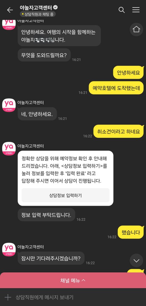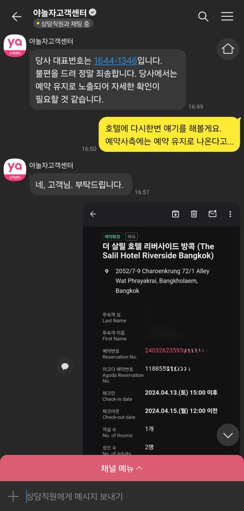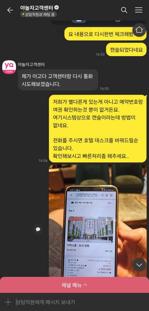 채팅으로는 답답해서 호텔 직원과 고객센터가 통화할 수 있도록 유도해보았으나, 야놀자 측에서는 통화를 하더라도 당장 해결해 줄 수 있는 부분이 미흡하다고 합니다. 그러면서 공급사인 A사를 통해 확인한 결과 취소된 상태가 맞다고 합니다.