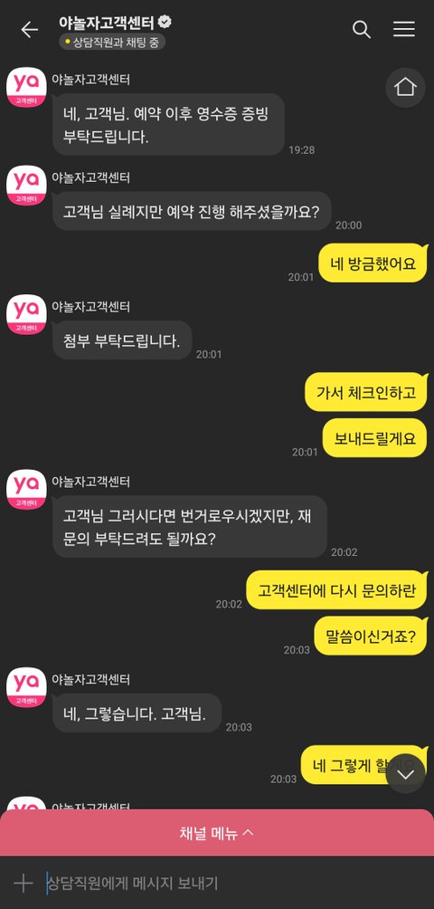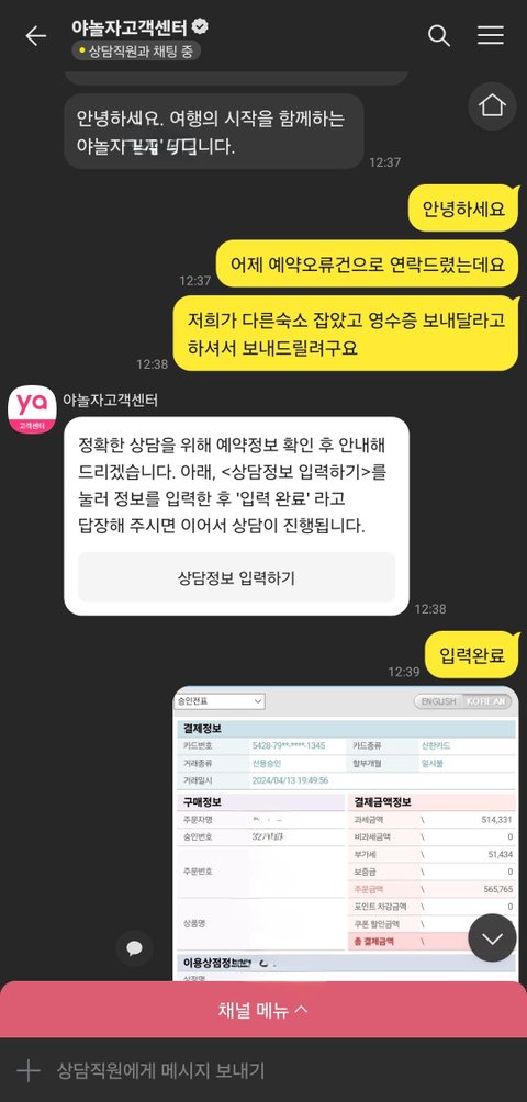 야놀자 고객센터에서 예약했으면 영수증을 달라고 채팅이 왔지만 혹시나 여기도 문제가 생겨 못 들어가는 일이 생길까봐 입실하고 바로 보내주겠다고 이야기했습니다. (아래 파일부터는 한국에 돌아와 추가로 캡쳐한 건이라 2시간의 시차때문에 현지시간과 조금 차이납니다)