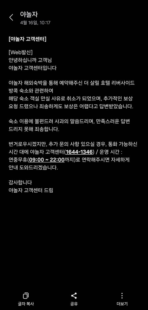 그리고 야놀자 고객센터에서 한통의 문자가 왔습니다. 전화로 안내하는 성의조차 보이지 않습니다.