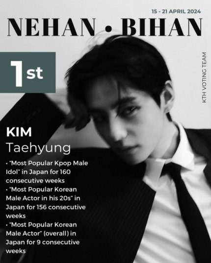 또한, 한국 배우들의 주간 인기 랭킹과 드라마 정보를 전달하는 '비한'(BIHAN)에서 진행한 투표에서 뷔는 '20대 남자배우 랭킹' 부문 156주 연속 1위라는 성과를 거뒀다.