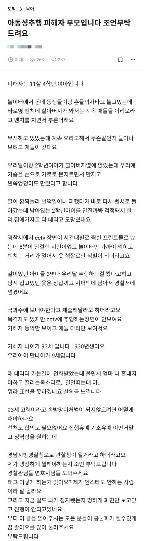 93세 노인이 놀이터에서 초등학생 성추행함