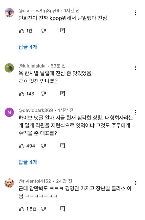 아이릿상대로 역바이럴돌렸다고 ㅈㄹ하더니 뉴진스 정산관련기사부터 언론플레이 ㅈㄴ해대노 뉴진스는 뭐 10대아니고 안어려? 지들이 더 하면서 왜 억울한척하는거임 물론 당연히 민희진 쉴드치는거아님