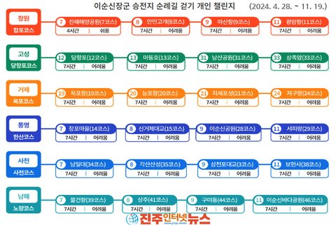 이순신 장군 승전지 순례길 걷기 챌린지 시작 (4월 28일~11월 19일)합포해전·당항포해전·옥포해전·한산해전·사천해전·노량해전 등 6개 해전 모티브