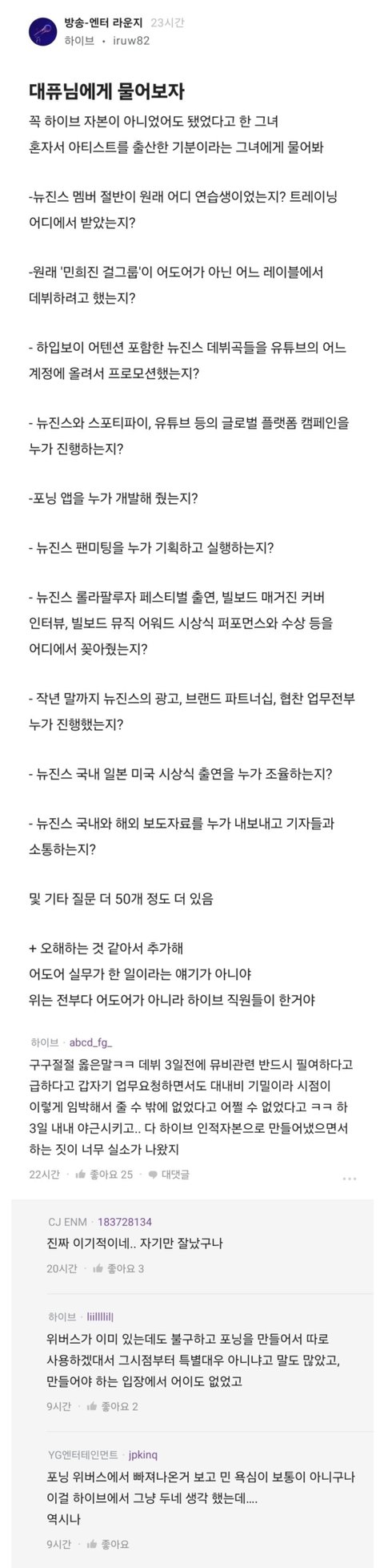 하이브가 가장 압도적이고 소속 가수들은 매우 감사해야함.