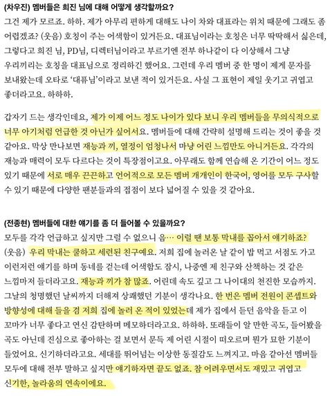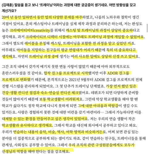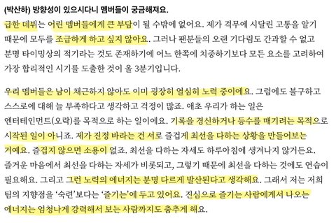내 편견으로는연습 때는 헝그리 정신으로 빡세게 할 거 같다는 엔터계의 고정관념이 있었는데기존의 고정관념과 좀 결이 다르게 간다는 느낌?