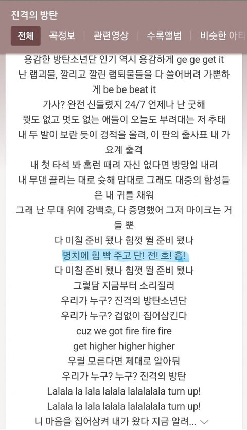 진격의방탄 가사 중 “단!전!호!흡!“