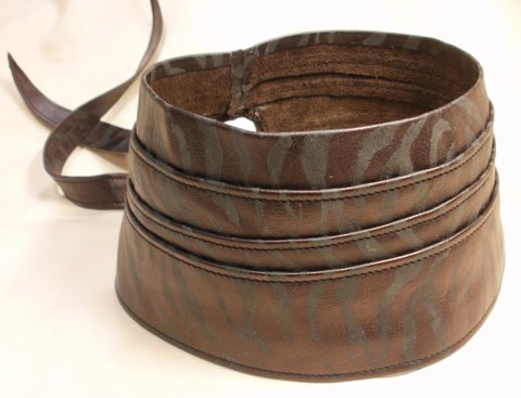 브라운톤의 부드러운 나파 가죽과 블랙 톤의 가죽에 호랑이 무늬를 염색하여 제작한 천연 가죽 두건입니다.(마디샤)
