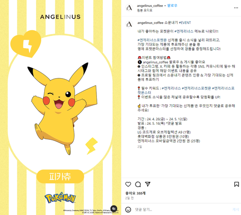 엔제리너스에서 포켓몬스터 음료 출시 했넹이름도 존귀ㅠ망고딸기 피카츄블루요거 마자용밀키베리 푸린이브이 초콜릿케이크출시 기념으로 소문내기 이벤트 한다는데1등은 청소기2등 롯백 상품권 5만원3등 엔제리너스 2만원 모바일금액권이라고 함관심 있는 사람들은 5월 12일까지 참여 가능하다고 하니엔제리너스 인스타 채널에서 확인 ㄱㄱㄱ