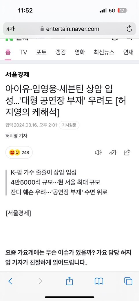 상암월드컵경기장에서 세븐틴 콘서트 하네요ㅎㅎ근데 잔디훼손 어쩌고 말 많던데.. 지금 큰 공연장 없어서 상암월드컵경기장도 겨우 하나봐요서울에서 젤 큰 공연장이라서 6만명 들어간다는데가수들 입장에서 대형 공연장이 없어서 선택권도 없는 듯….. 임영웅은 스탠드석만 공연한다는거 같은데 말 다했죠