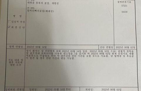 -> 전치 16주 진단명 대퇴골 개방골절 발허리뼈 폐쇄골절