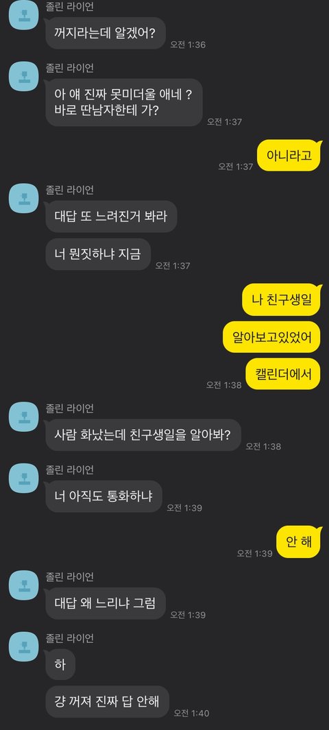 근데 미안한데 나 저거 뭔느낌인지 앎 ㅜ 답답해서 ㅜ 나랑 싸우는 중인데 친구 생일 보고 잇고 대화에 집중 안하는거 뭐 말하면 단답만 하는거 ㅈㄴ 답답햣움