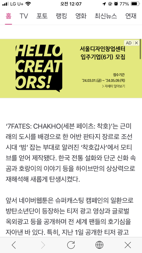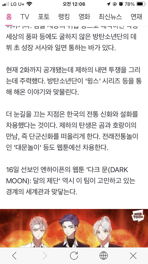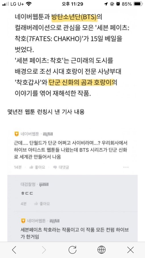 사진 속 기사도 봐주시고 하이브 방탄 웹툰이라고 검색하면 기사들 더 나와요 기사에서 말하는 단군신화웹툰은 다른 하이브 아이돌이 아니리 방탄만 해당됩니다
