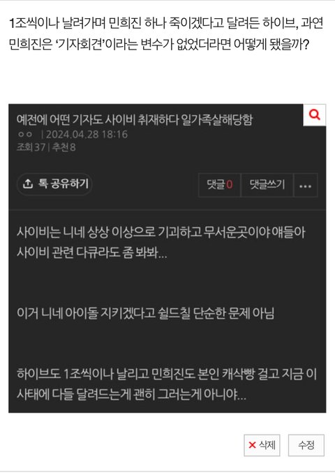 이건 그냥 르세라핌 안티가 쓴 글같은데? 이번일이랑 관계없이 걍 르세라핌 까는애가 쓴글인거같구만 뭘 반응해줌 걍 무시 ㄱ