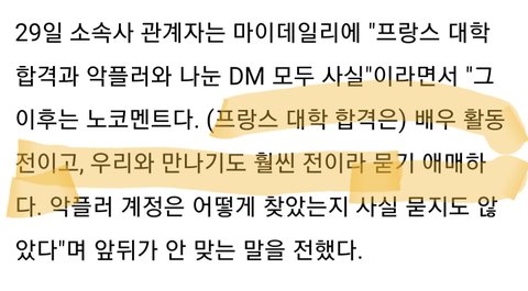 29일 소속사 관계자는 마이데일리에 "프랑스 대학 합격과 악플러와 나눈 DM 모두 사실"이라면서 "그 이후는 노코멘트다. (프랑스 대학 합격은) 배우 활동 전이고, 우리와 만나기도 훨씬 전이라 묻기 애매하다. 악플러 계정은 어떻게 찾았는지 사실 묻지도 않았다"며 앞뒤가 안 맞는 말을 전했다. 본인 확인을 거치지 않고 '모두 사실'이라는 공식입장은 어떻게 나온 걸까.