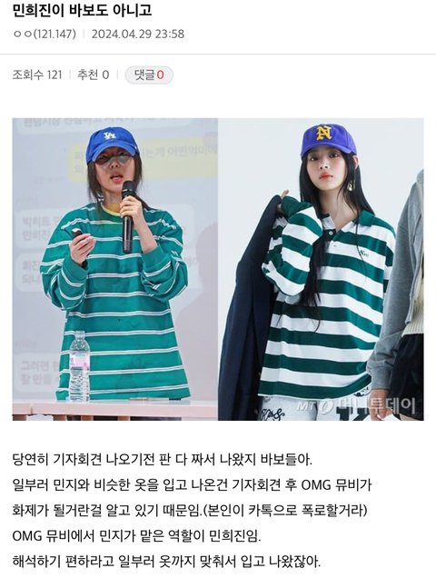 민지 의상이 바뀌었는데 그게 미니진이랑 똑같은 옷으로 바뀜.. 다른 멤버들은 다 다른데 민지만 그래