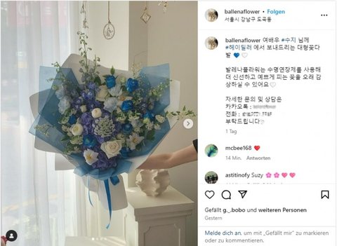 1일 한 꽃배달 전문점이 인스타그램에 "여배우 수지 님께 헤이딜러에서 보내드리는 대형 꽃다발"이란 내용의 글과 사진을 게재했다. 형형색색의 꽃이 가득 담긴 꽃다발은 '헤이딜러' 브랜드 로고 색상인 파란색과 유사한 푸른 꽃과 포장, 리본이 사용됐다.