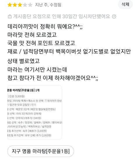 혹시 점주의 기분이 상하게 하는 리뷰라는게 그 이유가 아닐까요