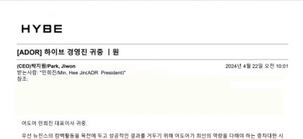 4월 22일 오전 10시 박지원 대표가 어도어의 내부고발 이메일에 회신했다고 합니다. 동시에 하이브는 부대표 노트북을 압수하는 등 감사를 시작했습니다. 뿐만 아니라 동시에 민 대표의 사임을 요구하고 주주총회 소집을 요구하는 공문을 보내 왔습니다. 그러더니 바로 몇 시간 뒤 어도어 경영진에 전격 감사권을 발동하였다는 뉴스기사가 연이어 보도됩니다. 그리고, 다음날에도 마치 실시간 중계처럼 하이브의 인신 공격성 언론활동으로 인한 기사가 이어집니다. 하이브에 되묻고 싶습니다. 민희진 대표의 내부고발 이메일에는 어떤 답변을 하신 겁니까?