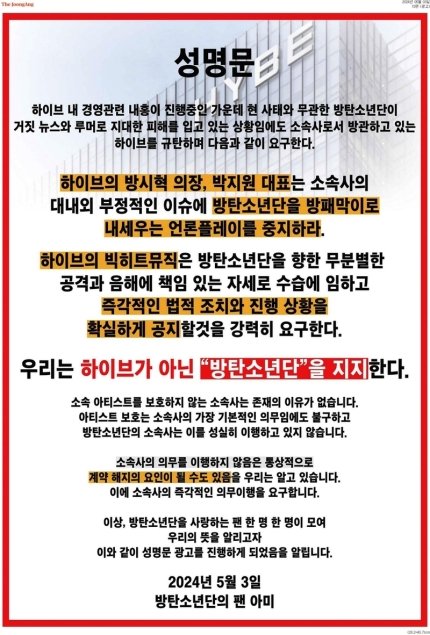 오늘(3일) 가요계에 따르면 아미는 '방탄소년단의 팬 아미'의 명의로 일부 신문에 전면 광고 형식의 성명을 내고 "하이브와 빅히트뮤직은 방탄소년단을 향한 무분별한 공격과 음해에 책임 있는 자세로 수습에 임하고 즉각적인 법적 조치와 진행 상황을 확실하게 공지하라"고 요구했습니다.