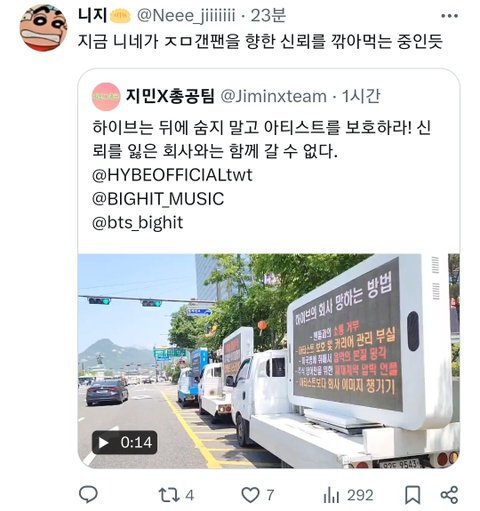 4.보이콧으로 1년넘게 ㅈㄱ이가 공격받고 있을때도 못본척하고 신차독려도 안하고 가만히 있다가 ㅎㅂ도 보이콧으로 공격받아서 이제야 ㅂ이콧 공격이 오래된걸 알게 된 한국팬들이 보이콧은 절대 안된다고 신차독려하니까 갑자기 저계정 올팬인척 지도 보이콧 알지만 변방외퀴들의 별거아닌일인척 정치질함, 그것도 모자라서 ㅈㄱ이 보이콧으로 그동안 소리없이 신차독려해온팬들한테 니들이 보이콧 수면위로 가져온거라면서 갑자기 보이콧신고하는 ㅈㄱ팬들 허공저격함
