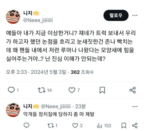 6.지금도 ㅈㅁ악개들이 ㅈㅁ총공팀 인용으로 날뛰는데 걔넨 안패면서 ㅈㅁ악개들 싸잡히는거에 발작해서 ㅈㅁ악개 저격이 아닌 다른멤버 악개들 저격하면서 팬덤싸움도 아닌 그저 ㅈㅁ악개들이 한짓 욕하는게 그걸 정치질한다고 지가 오히려 정치질하고 있음