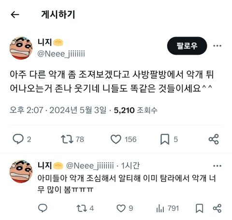 그리고 본인은 ㅈㅁ악개 공격하는 타멤악개한테 직접 공격하는건 또 괜히 눈치보여서 다른악개들 공격해주는 진짜 올팬 계정글만 계속 알티하고 ㅈㅁ악개패는글은 형식적으로 한두개 알티하고 다른멤악개패는글을 더 많이 알티함…