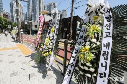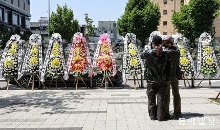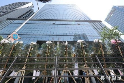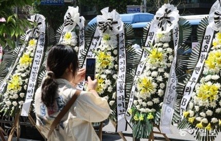 방탄소년단(BTS)의 팬덤인 아미(ARMY)가 3일 서울 용산구 하이브 사옥 앞에 수십 개의 근조화환을 줄지어 세웠다.